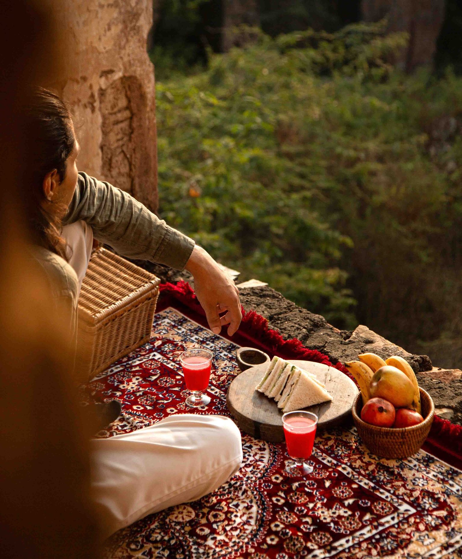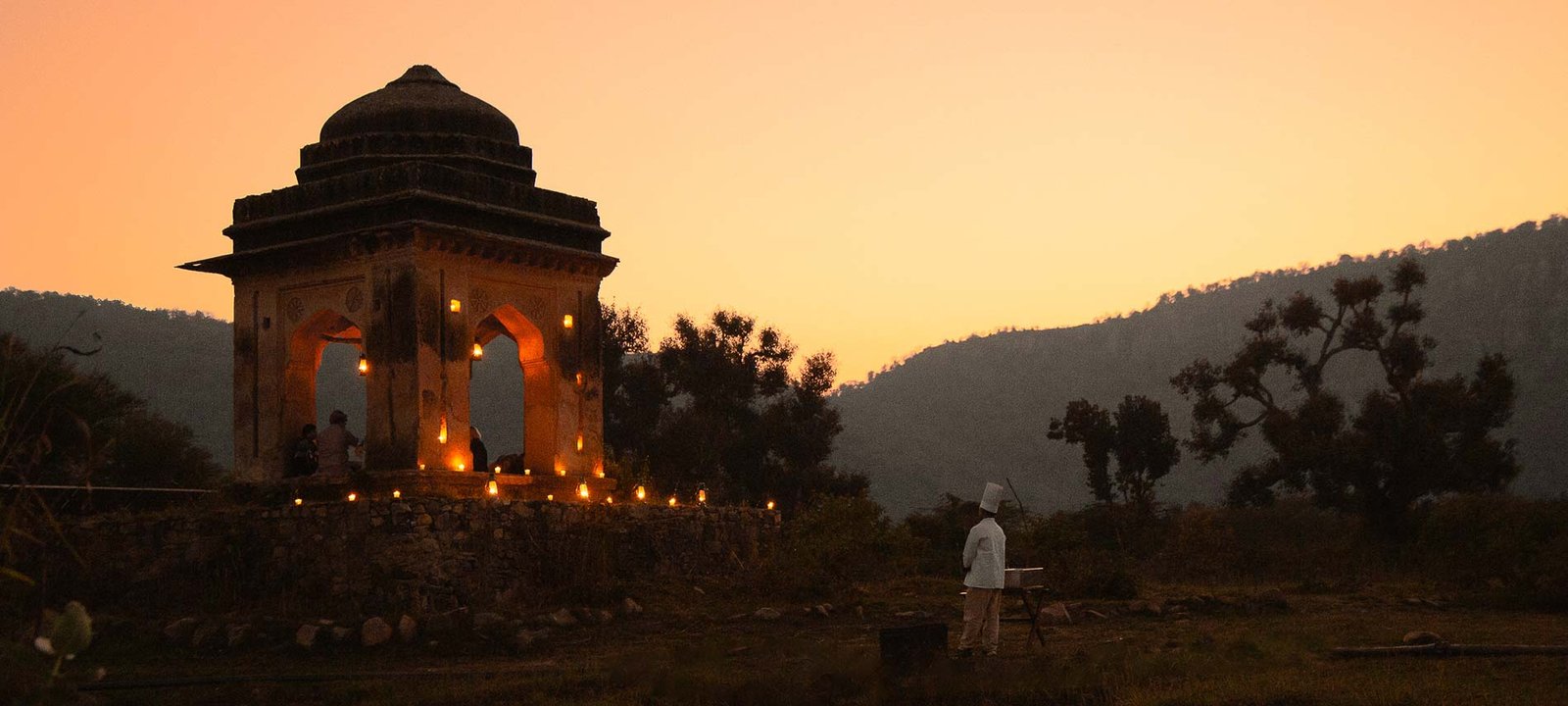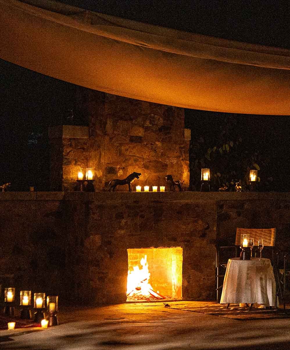 As twilight drapes the fields, an ancient stone chhatri transforms into a private setting for a romantic barbecue dinner. Soft candlelight and lamps illuminate the pavilion, while the strains of a sitar from Alwar’s venerable music house drift through the evening, mingling with the sounds of the wild. The night unfolds in intimacy and warmth for an unforgettable dining experience.