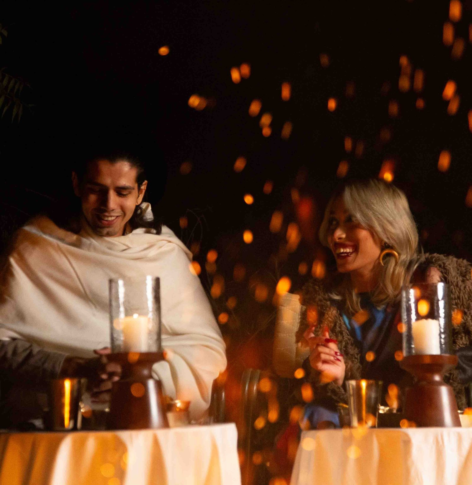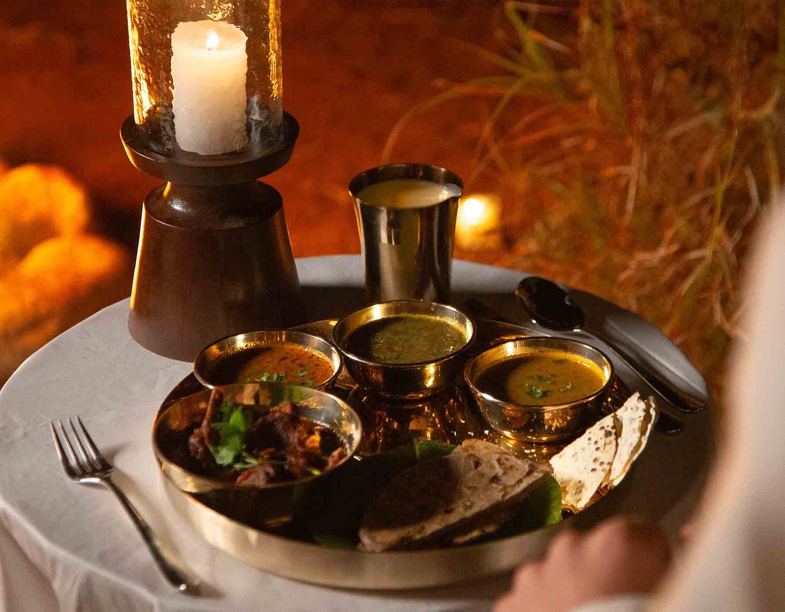 Beneath a canopy of stars, a hidden corner of the lodge, tucked among tall dhaman grass, hosts a multi-course feast carefully prepared in earthen pots over open flames of a traditional chulha, drawing on fresh, local ingredients and time-honored village flavors, while the sounds of the night and distant wildlife rise around the setting.